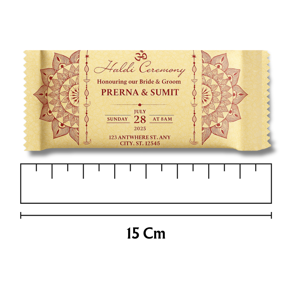 Make your Haldi ceremony truly unforgettable with our Customized Haldi Ceremony Chocolate Bar Pack. Designed with elegant traditional motifs and mandala art, this unique chocolate wrapper can be fully personalized with the couple’s names, event date, and venue details.