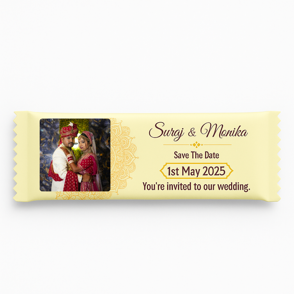 Make your wedding invitation truly unforgettable with our Personalized Wedding Invitation Chocolate Bar – a unique and delightful way to invite your loved ones! Each 25 gm bar features your photo, names, wedding date, and a heartfelt “Save The Date” message printed directly on the wrapper.